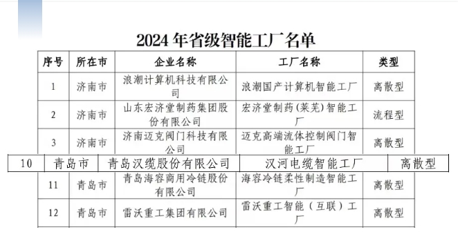 近日,山東省工業和信息化廳正式公布了2024年省級智能工廠、數字化車間、智能制造場景及智能制造系統解決方案供應商的名單。經過嚴格的申報、推薦及專家評審程序,青島漢纜股份有限公司憑借其卓越的智能制造實力和創新能力,成功入選省級智能工廠名單,標志著公司在智能制造領域邁出了堅實一步。