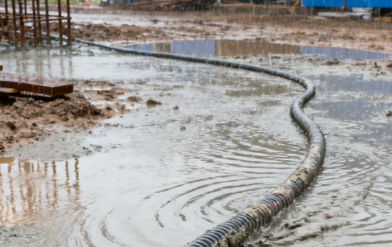 雨天施工時,電力電纜隨意拖地并浸泡于積水中,構(gòu)成顯著安全隱患。電纜絕緣層在潮濕環(huán)境中易受損,尤其是已有磨損或老化跡象的電纜,絕緣性能會進(jìn)一步下降。積水中可能混有金屬碎屑、化學(xué)物質(zhì)或鹽分,形成導(dǎo)電介質(zhì),增加漏電風(fēng)險。接口處、破損點(diǎn)若被水浸入,會導(dǎo)致內(nèi)部導(dǎo)體暴露,可能引發(fā)短路。