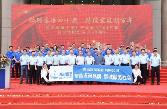 7月1日,在中國共產黨成立101周年華誕之際,青島漢纜股份有限公司迎來成立40周年,在這隆重喜慶的日子里,股份公司組織了盛大的慶典儀式。公司創始人漢河集團董事局張思夏主席,功勛人物獲得者陳沛云先生、張學宏先生,集團公司張大偉董事長受邀出席。股份公司張立剛董事長,張林軍總經理及各個部門領導及員工代表參加慶典活動。